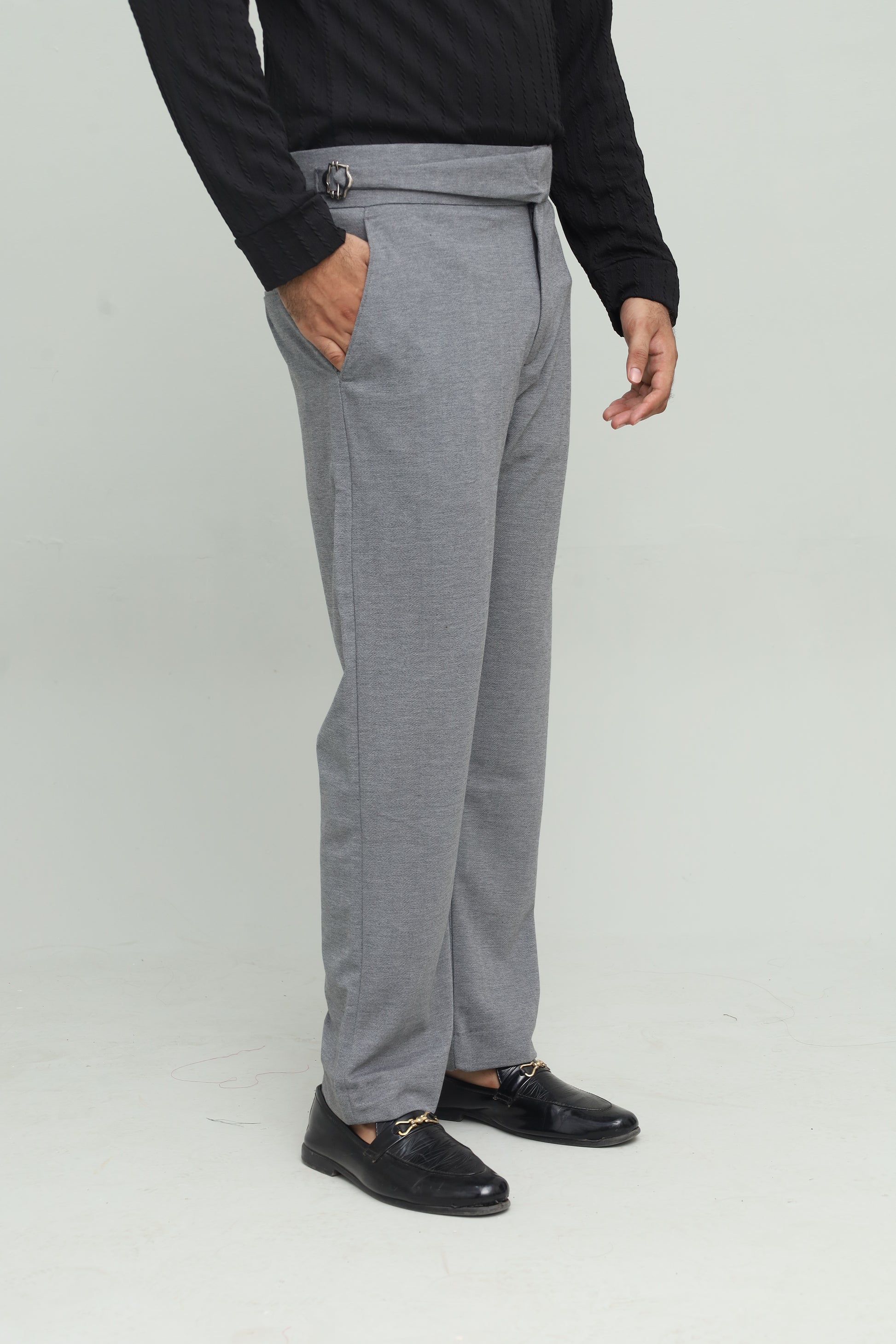 - Design: Double pleats, extended waistband with buckle side adjusters, button-front closure